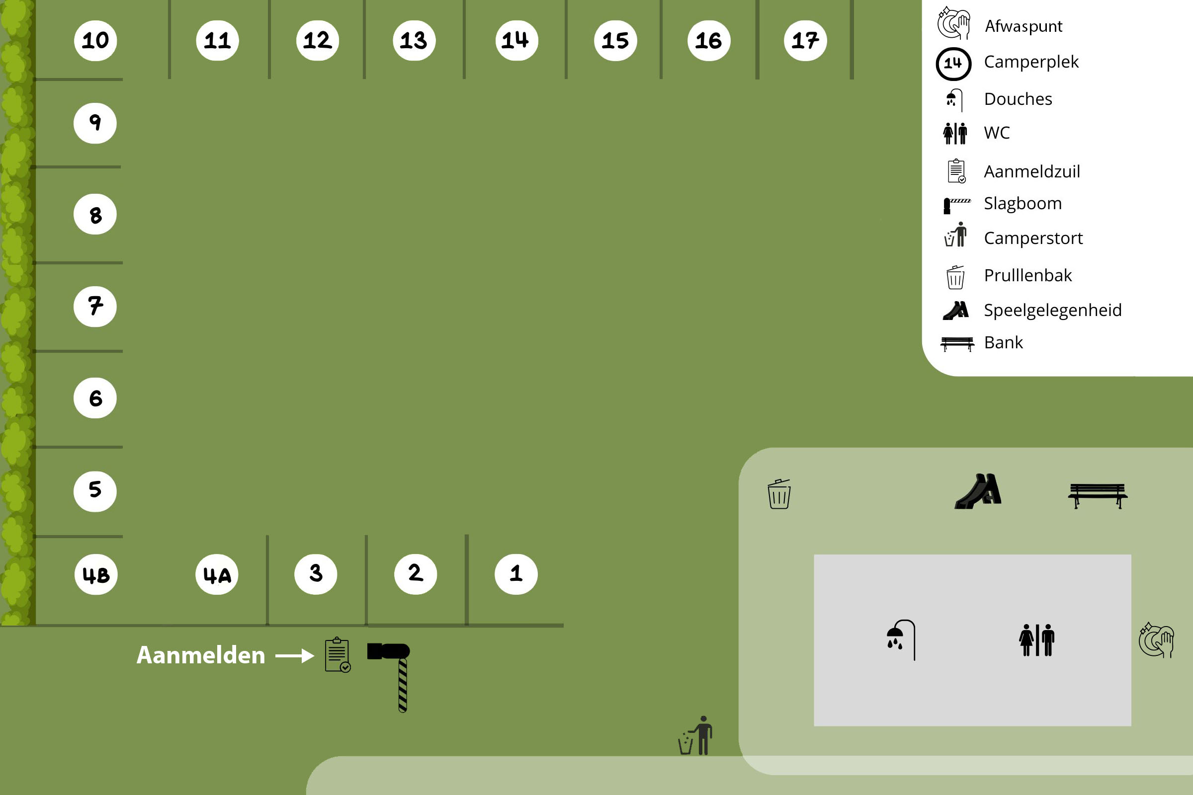 Op de kaart vind je een overzicht van onze camping, inclusief alle voorzieningen en de 17 ruime plekken voor campers, caravans of tenten. In de legenda rechtsboven leggen wij alles graag voor je uit!
